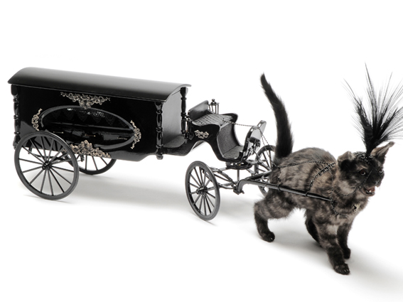 Taxidermied cat wearing diamond-encrusted bridle, pulling a funeral carriage (by Julia deVille)