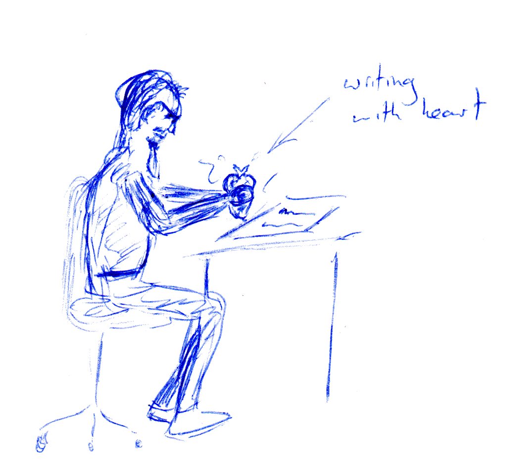 1. Ha ha! Love the advice, love the messy heart-writing image… although the level of mess would depend what kind of heart you had. If you had a heart of stone, for example, you could possibly write with it, without being too messy, by scratching lines on something less hard. If you had a black heart, the charcoal would definitely make writing easier, though that would be fairly messy. And what if your heart actually belonged to someone else? It could get messy asking for it back just to do some writing 🙂