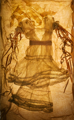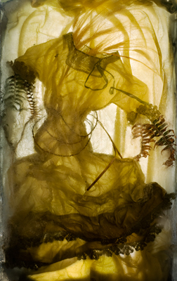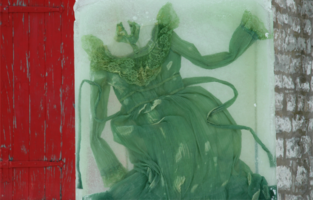 On her website, the artist explains: “IceShifts is a series of photographs consisting of deconstructed garments frozen into blocks of ice, which are then photographed. This new artwork grew out of a photographic study of fabric suspended in water, which evolved into freezing clothing and enabling the light to shine through it. […] Although frozen in time, the garments appear to dance, simultaneously forming and deforming, like unmasked shape shifters.”