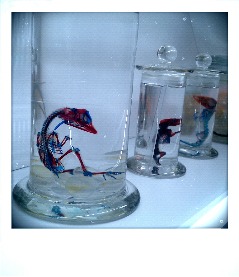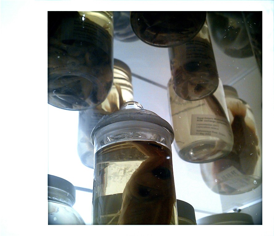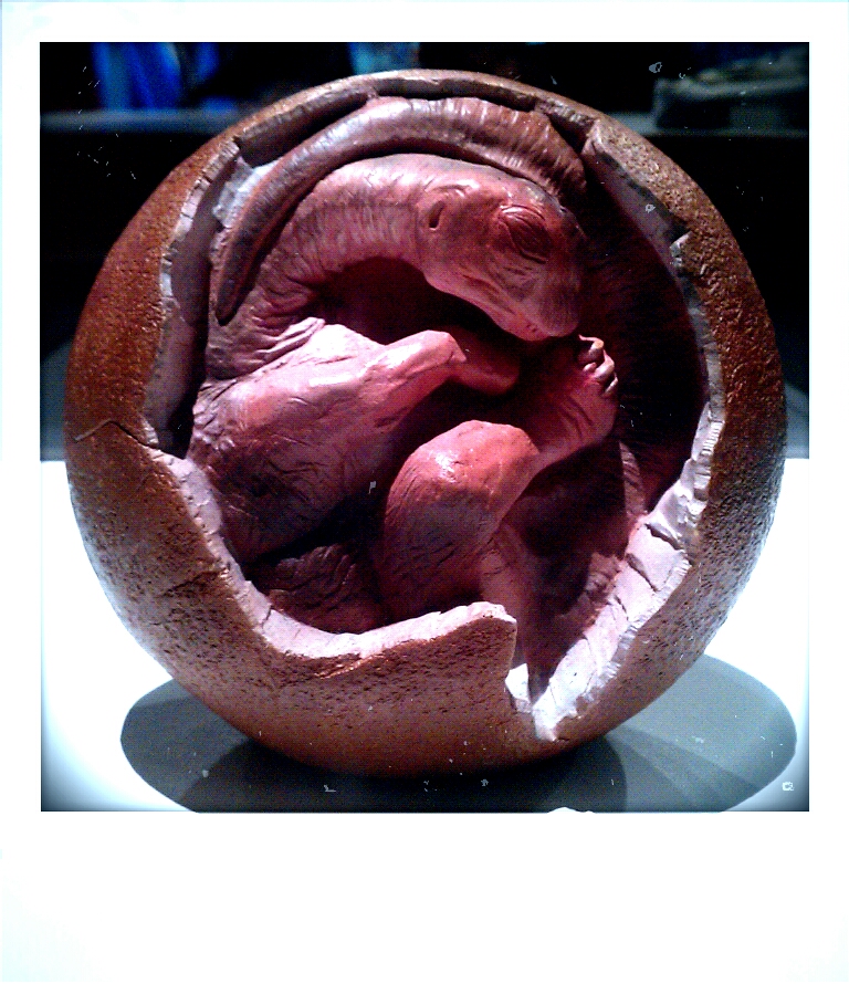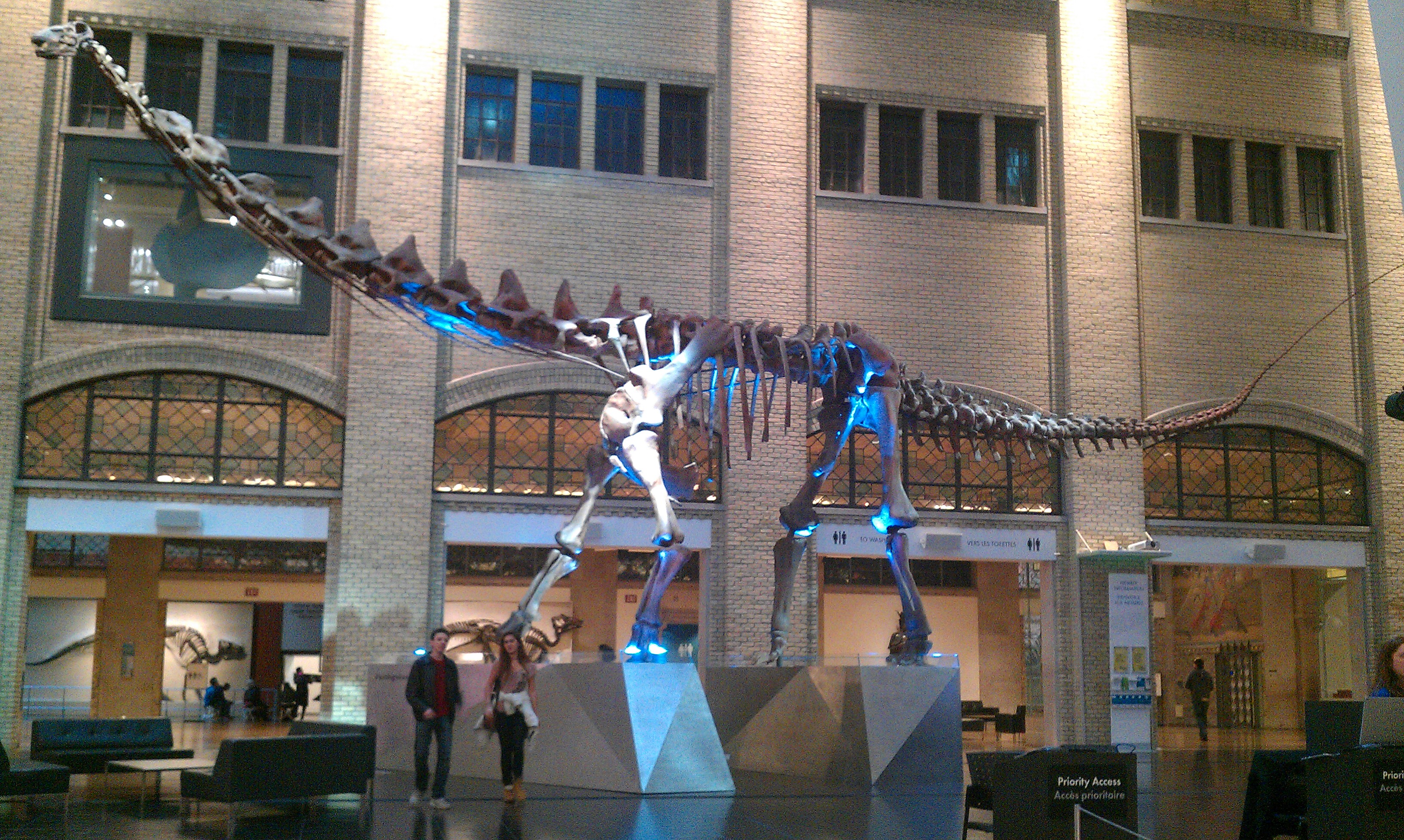On a different day, we headed to the Royal Ontario Museum because (a) I love museums, (b) this one is currently showing a dinosaur exhibit, and (c) I can’t resist dinosaur exhibits, even if they’re crap. Which this one wasn’t. Well, not entirely. There were some awesome elements. The projections and interactive features were spectacular: videos showing millions of years of continental drift, outlining the rise and fall of the dinosaurs and where they ended up over the years, and predicting the eventual return of Pangaea (in a mere several hundred million years from now…) And the variety of “fossils” was great as well. But I put “fossils” in quotes here because 99% of them were plaster, and though I can understand why using plaster casts of the fossils is a necessity, the nerd in me wanted to see some more really old bones. (Minor quibble, really. I had a great time in the exhibit).