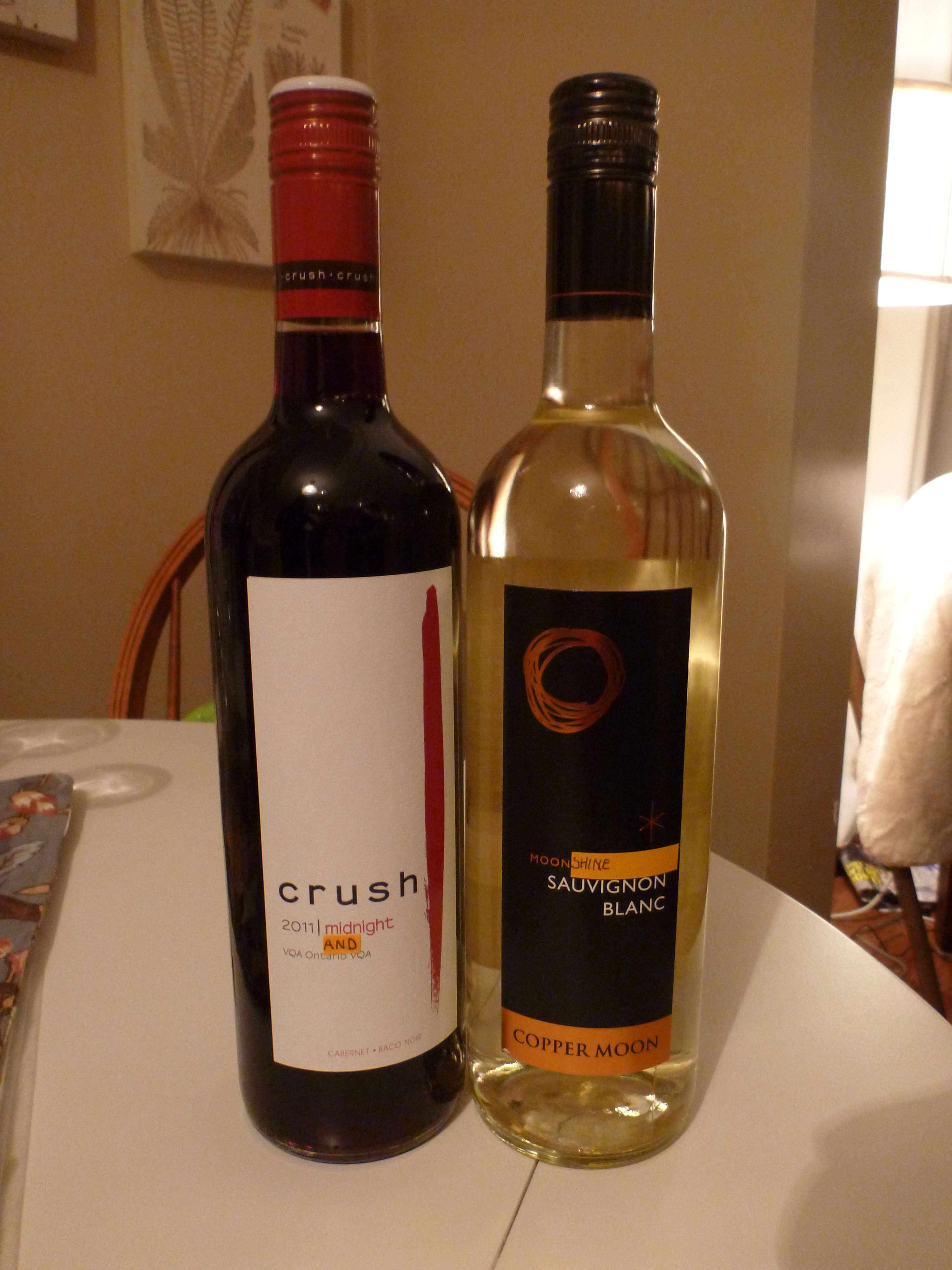 "Midnight and Moonshine" wine bottles, care of The Girls. (Look at the labels -- so cute!)