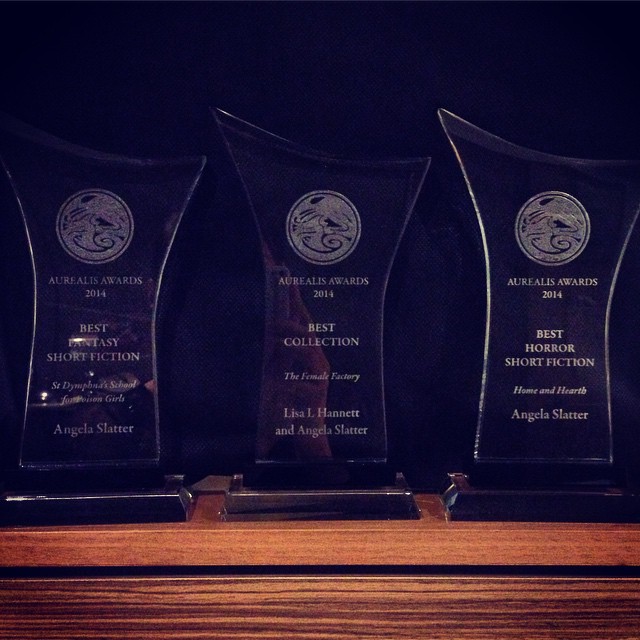 And then I turned into some weird mindless (and potentially rude) version of myself. The winner was announced and I saw The Female Factory‘s cover on the screen and then everything went silent and blurry. Angela stood up before me and over her shoulder said, ‘Do you have a speech prepared?’ — or something like that — and my mouth said NO! and I was then up at the podium (without even shaking Margo’s hand, or Nicole’s, or Leife’s — who’d presented the award) and my mind was empty but my mouth was moving, saying something about having no speech, and thanking Angela for being awesome (because she is) and thanking Chad for being an awesome partner (because he is) but I couldn’t hear anything, and Kate Forsyth and Cat Sparks were in the front row, and I was looking at their phones taking pictures, and they were smiling, and I had to pass the mic over to Angela because MY MOUTH WAS MOVING BUT NOTHING SENSIBLE WAS COMING OUT. For instance, I would have liked to thank the judges (thank you, judges!), and Twelfth Planet Press (thank you!), and Alisa Krasnostein (thank you!), and the Awards organisers (thank you!) — but I didn’t. I think Angela did (mind = blank, remember) and then we sat down, and I had to put the award on the seat next to mine because my hands were shaking with shock and disbelief, and the award is fragile and sharp and pointy (and pretty!) and I was afraid of dropping it.